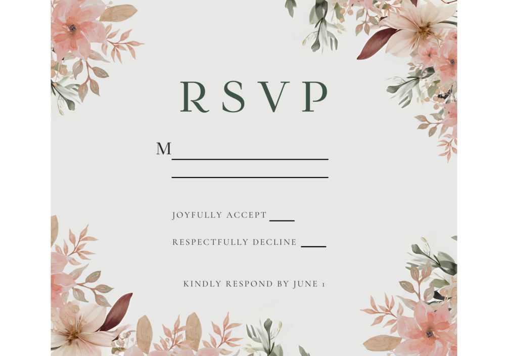 - Wedding Invitation Template ; Front and Back page - Light Pink Flowers Theme Template (5X7 Inches), Details page - Light Pink Flowers Theme Template (4X5 Inches), RSVP page - Light Pink Flowers Theme Template (4X3.5 Inches)