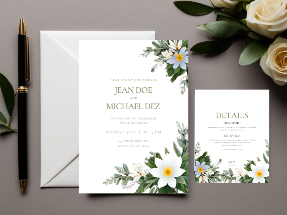 - Wedding Invitation Template ; Front and Back page - White Jasmines Theme Template (5X7 Inches), Details page - White Jasmines Theme Template (4X5 Inches), RSVP page - White Jasmines Theme Template (4X3.5 Inches)